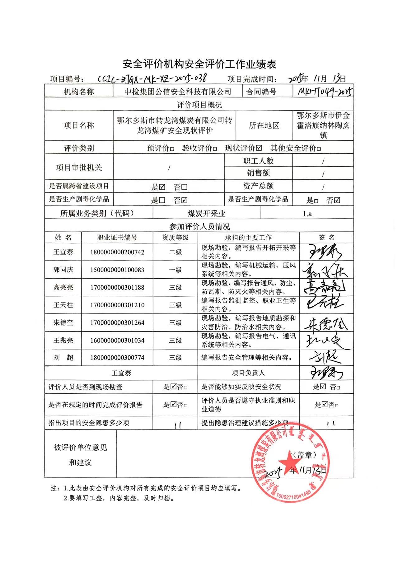 评价项目名称 | 鄂尔多斯市转龙湾煤炭有限公司转龙湾煤矿安全现状评价报告 | |||||