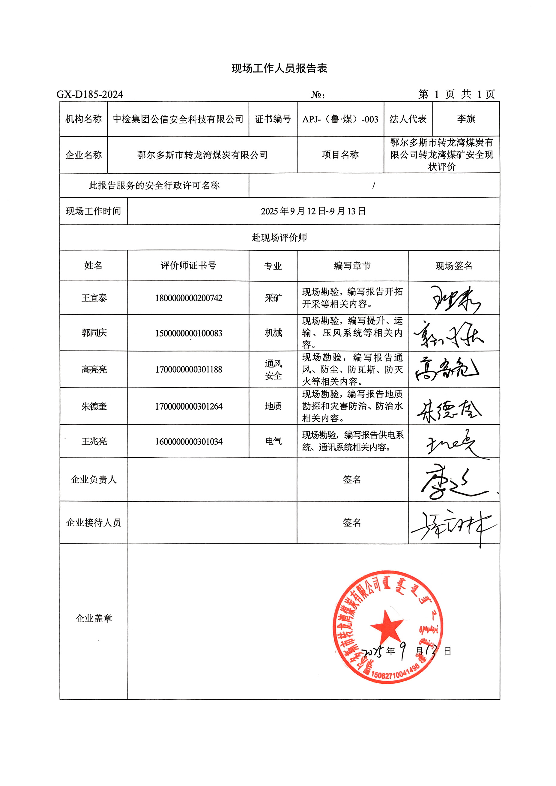 到现场开展安全评价工作的人员、时间及主要任务: 人员:王宜泰、郭同庆、高亮亮、朱德奎、王兆亮 时间、任务:评价项目组于2025年9月12日~13日到现场调查、检查;2025年10月20日编写修改完善报告。 | ||||||