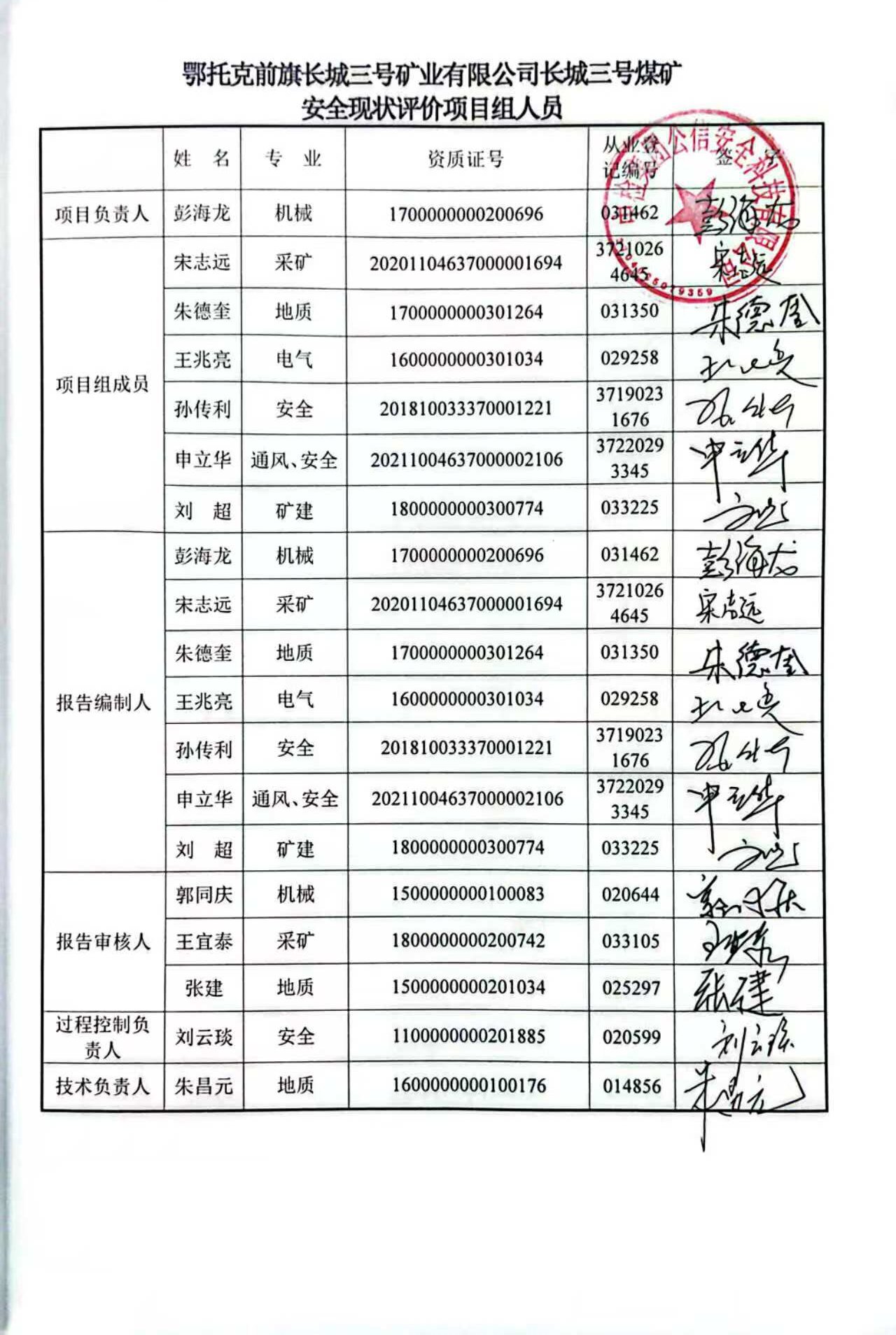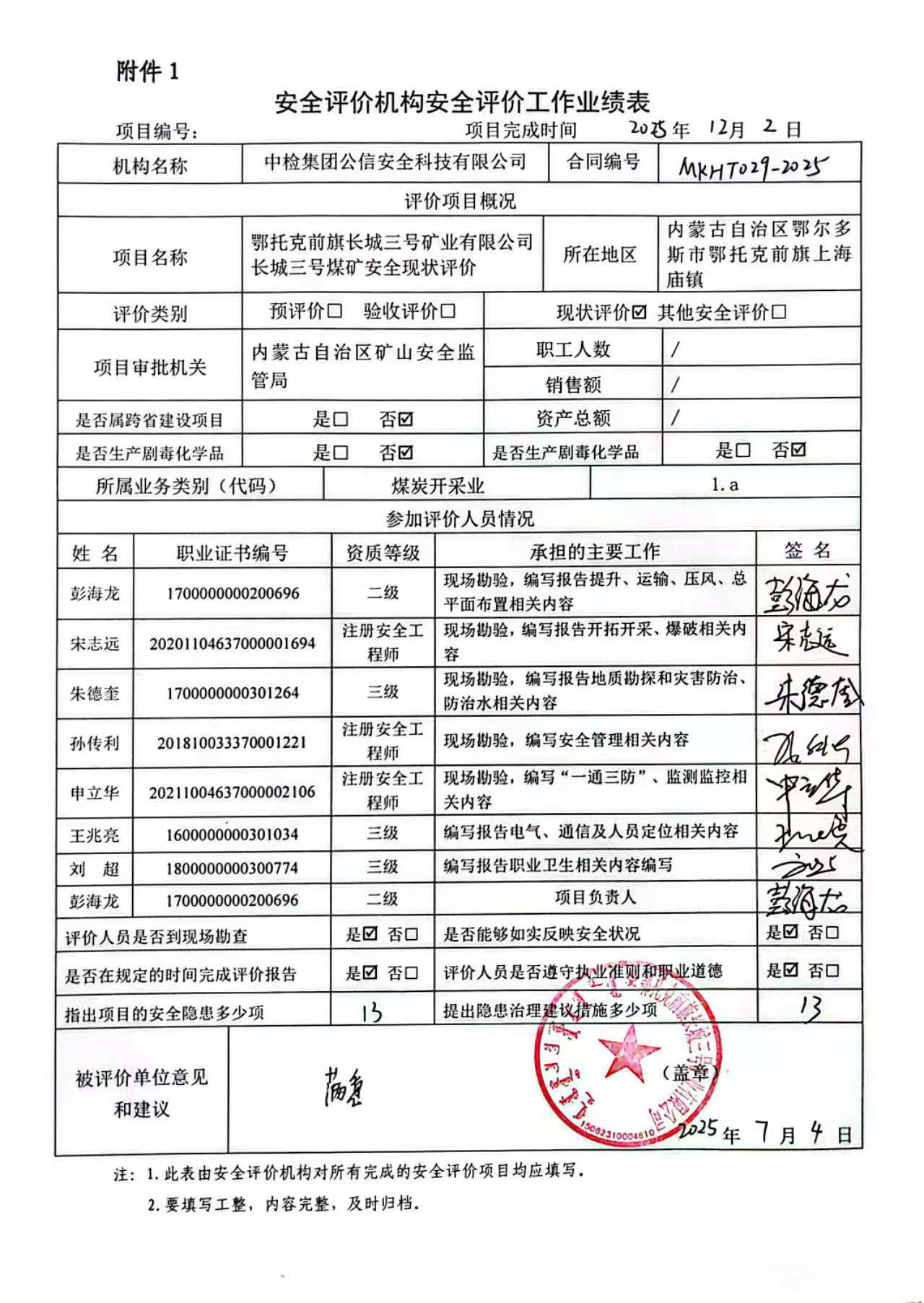 现场开展安全评价工作的人员、时间及主要任务: 彭海龙 孙传利 申立华 朱德奎 宋志远于2025年7月3日~4日到现场进行调查、搜集资料,进行现场评价。 彭海龙 宋志远于2025年7月6日对现场问题进行复查,矿方均已整改合格。 彭海龙 孙传利 申立华 朱德奎 宋志远 王兆亮 刘超 对报告进行了编写。 | |||||||