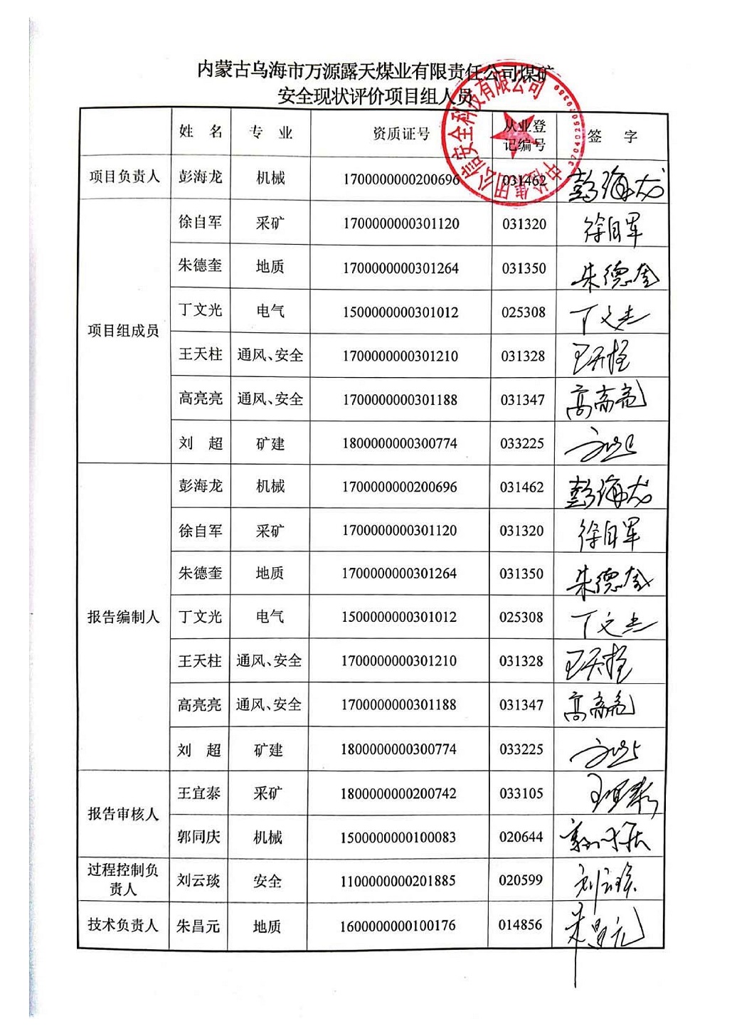 参与安全评价工作的注册安全工程师: 彭海龙 王天柱 高亮亮 朱德奎 徐自军 | |||||||