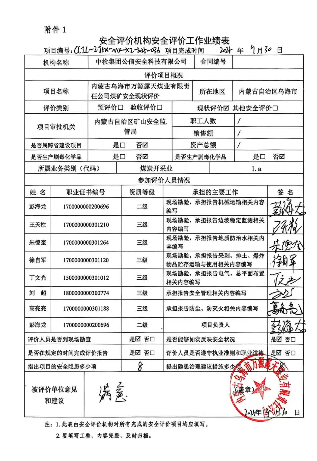 评价项目名称 | 内蒙古乌海市万源露天煤业有限责任公司煤矿安全现状评价报告 | ||||||