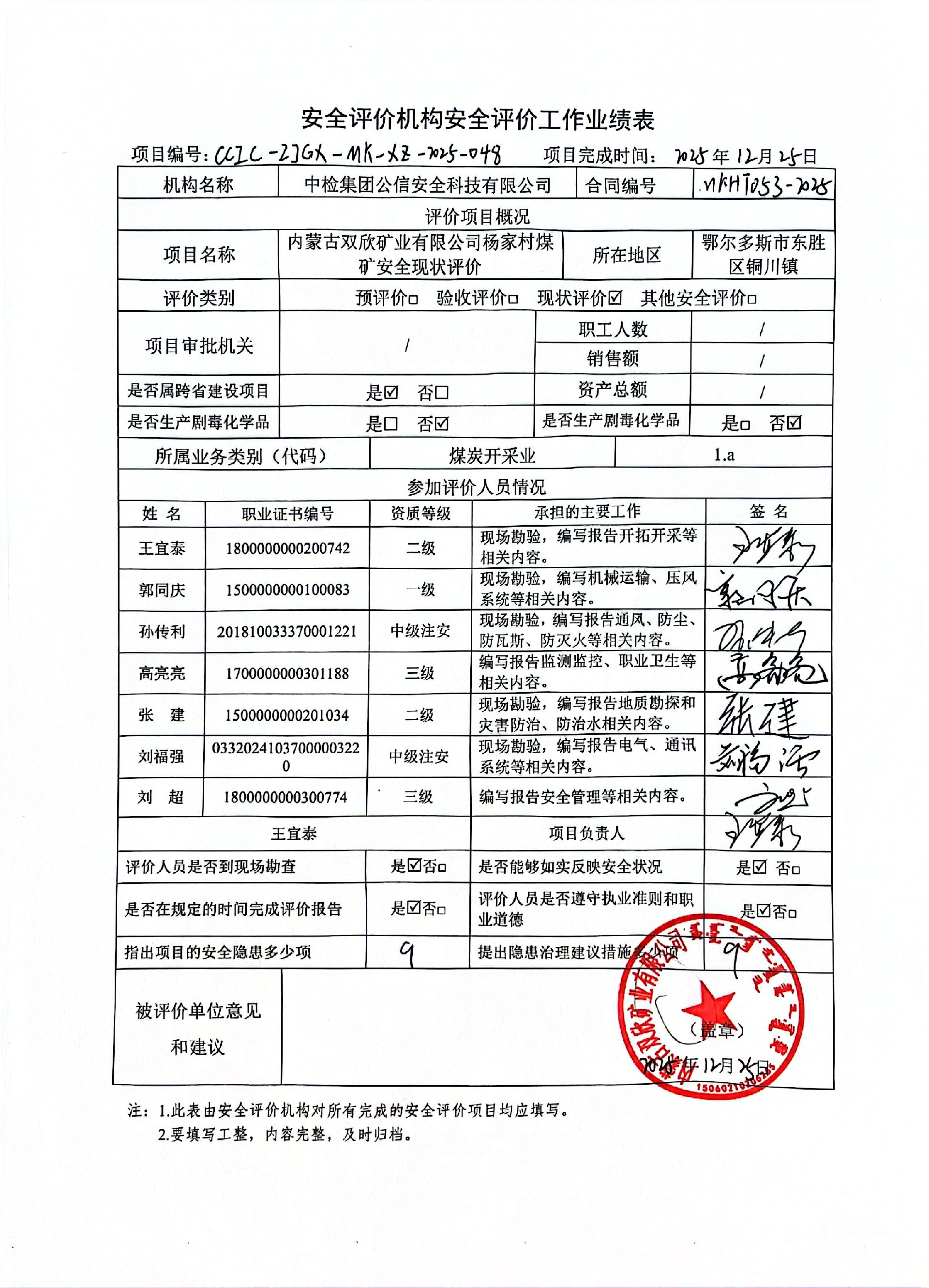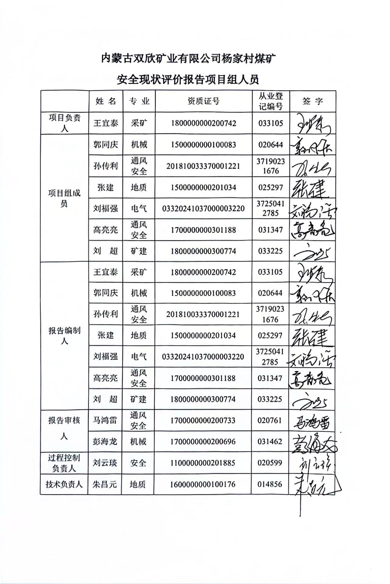评价项目简介: 内蒙古双欣矿业有限公司是由原淄博矿业集团有限责任公司与内蒙古双欣能源化工有限公司合资组建,并于2006年7月注册成立,其中原淄博矿业集团有限责任公司(山东能源集团西北矿业有限公司由兖矿能源集团股份有限公司和淄博矿业集团有限责任公司共同持股)出资55%控股。内蒙古双欣矿业有限公司杨家村煤矿位于内蒙古自治区鄂尔多斯市境内,行政区划隶属鄂尔多斯市东胜区铜川镇管辖。 内蒙古双欣矿业有限公司杨家村煤矿于2008年11月6日开工建设,2011年3月主体工程竣工,2011年5月进行试生产,2011年12月通过安全设施及条件竣工验收,设计生产能力5.00Mt/a。为解决矿井后续长期不达产问题,矿井需布置2个盘区同时生产,实现薄厚煤层搭配开采,同时为降低矿井已有回风立井风速并实现分区式通风,矿井进行通风系统安全改造(新建2#回风立井);2022年9月1日开工建设,2025年10月30日建设完成;2025年11月5日开始联合试运转,正常供风。目前正在联合试运转阶段,暂未验收。鄂尔多斯市能源局于2023年9月8日,以《鄂尔多斯市能源局关于内蒙古双欣矿业有限责任公司杨家村煤矿生产能力等要素信息的公告》公告其生产能力核增至6.00Mt/a。 | ||||||